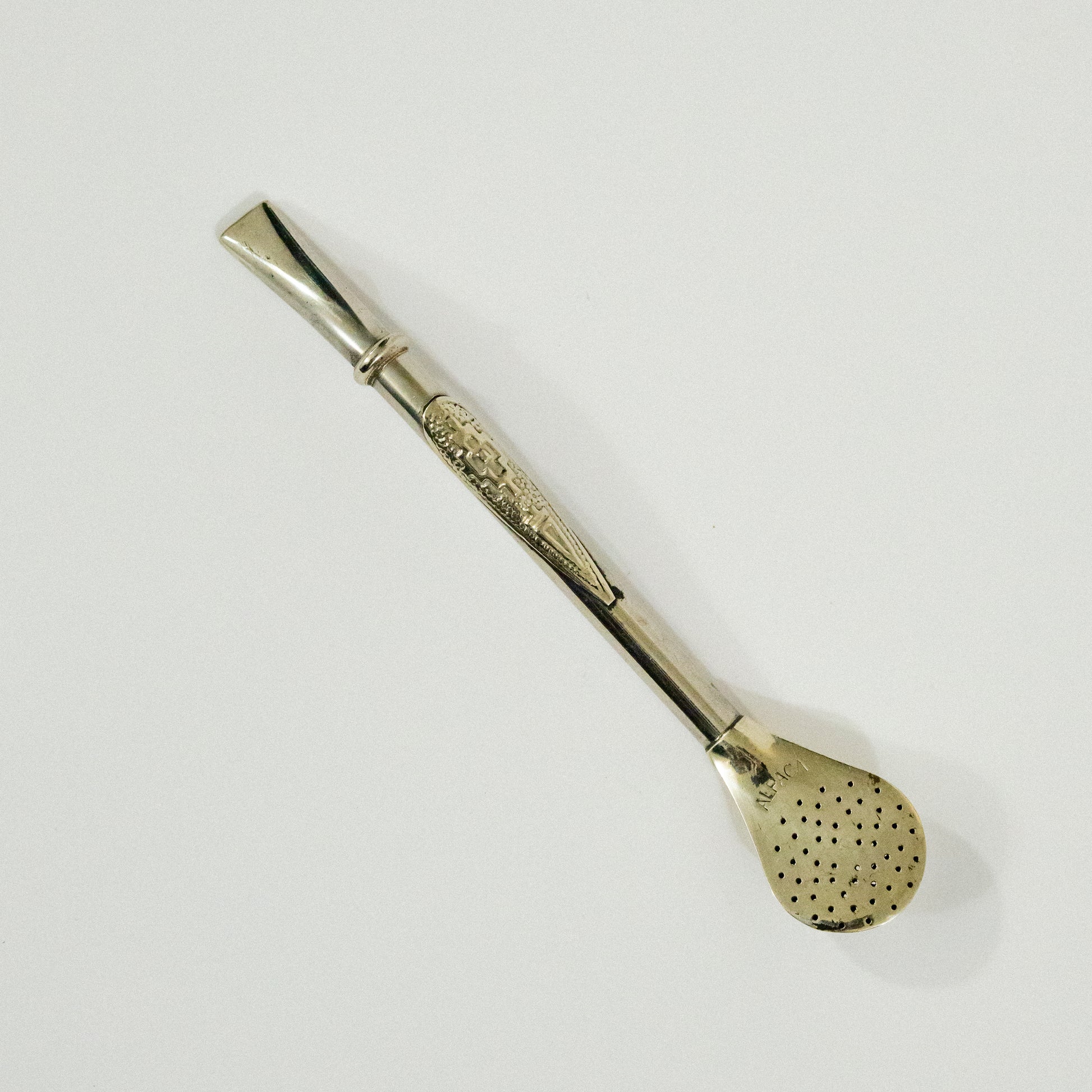 Este bombillón está elaborado en alpaca maciza, con un aplique artesanal de diseño pampa, inspirado en los símbolos de nuestra cultura gaucha. Fuerte, brillante y con estilo propio, es el compañero ideal para quienes disfrutan del mate con identidad y carácter.