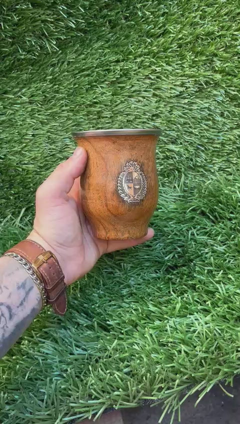 El mate más uruguayo que verás hoy. Hecho en algarrobo de alta calidad, estilo camionero, con boquilla metálica y un imponente escudo de Uruguay en alpaca incrustado sobre la madera. Tradición, identidad y carácter en cada cebada.