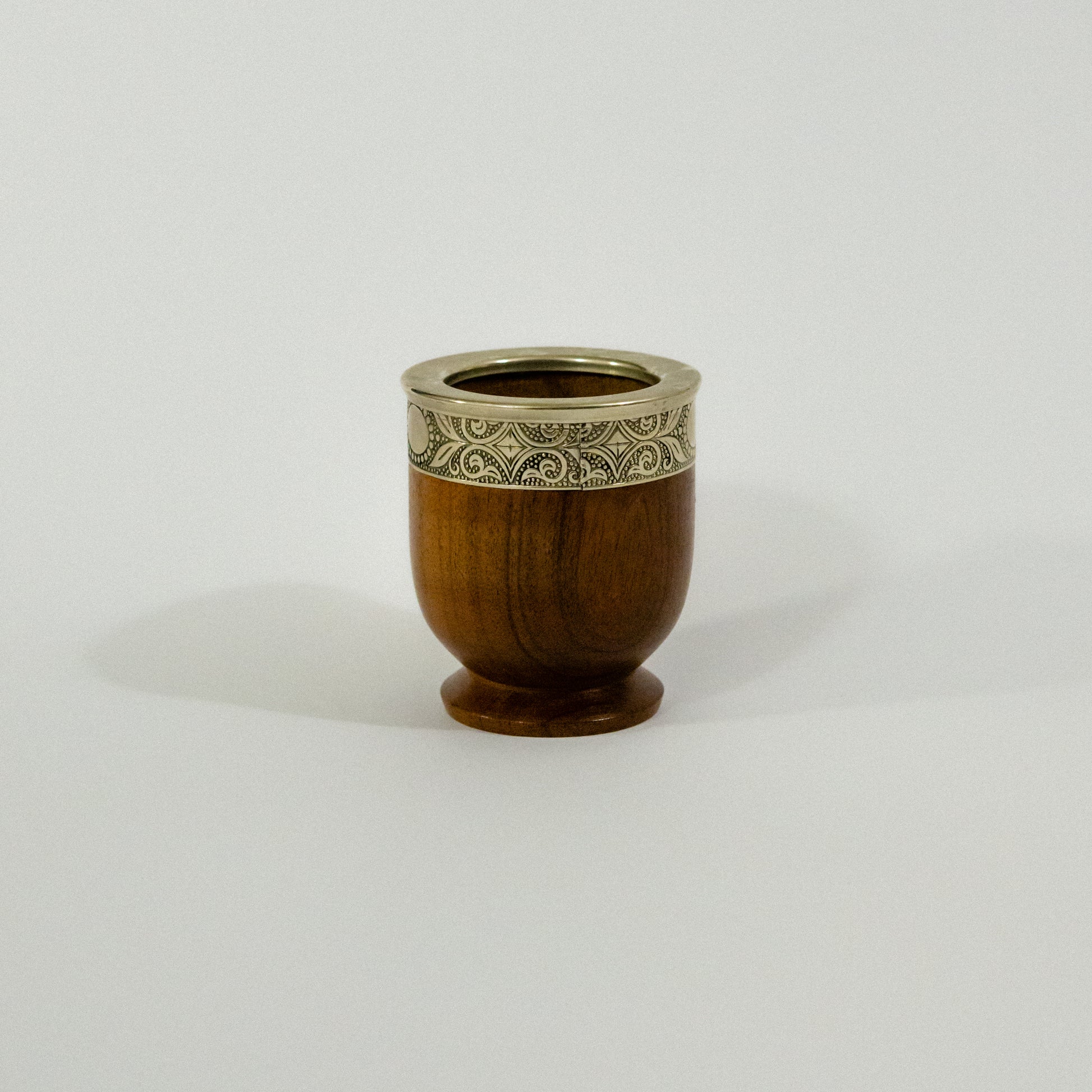 Sofisticación artesanal con raíces tradicionales. Este mate imperial está elaborado en madera de algarrobo, una de las más apreciadas por su resistencia y color natural. Su diseño se realza con un elegante fleje de alpaca trabajado a mano, que aporta distinción y durabilidad.